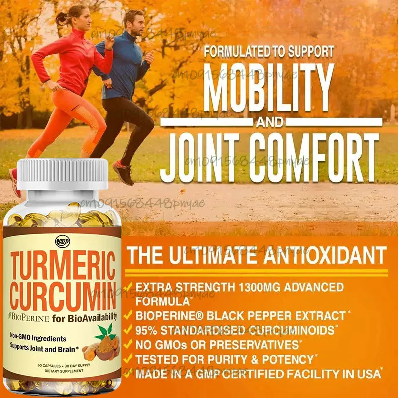 High-dose curcumin supplement with black pepper, focusing on joint, heart, and immune health.