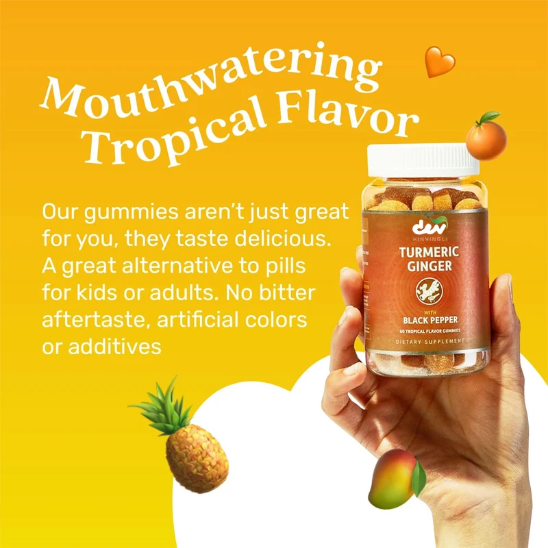 Gummies containing turmeric, ginger, and black pepper, aimed at immune and joint support, and inflammation.