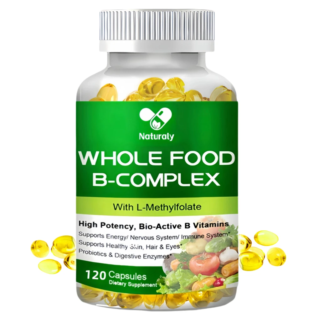 Vitamin B Complex Capsules B1, B2, B3, B5, B6, B7, B9, B12 Whole Food Supplement for Stress, Energy and Immune Support Non-GMO